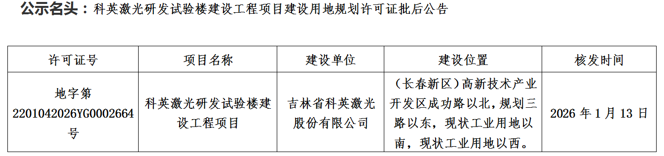 科英激光研发试验楼建设工程项目建设用地规划许可证批后公告
