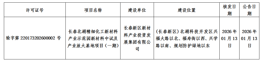 长春北湖精细化工新材料产业示范园新材料中试及产业放大基地项目(一期)批后公告
