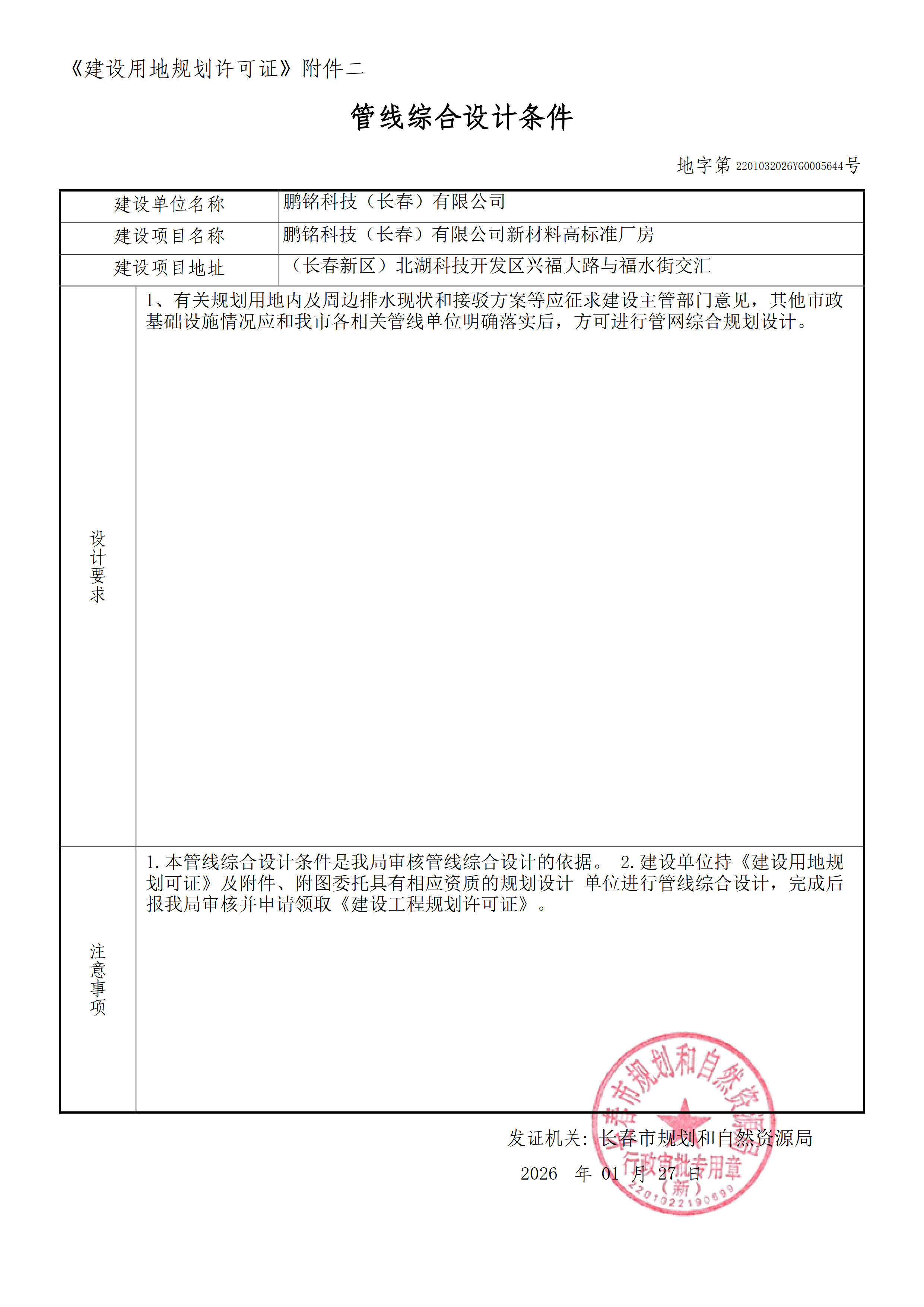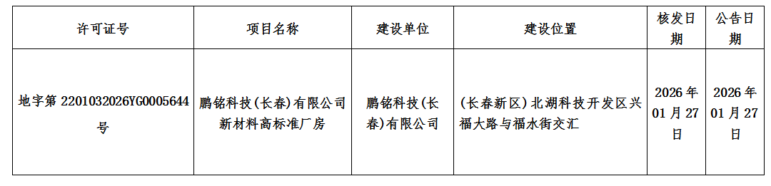 鹏铭科技(长春)有限公司新材料高标准厂房批后公告