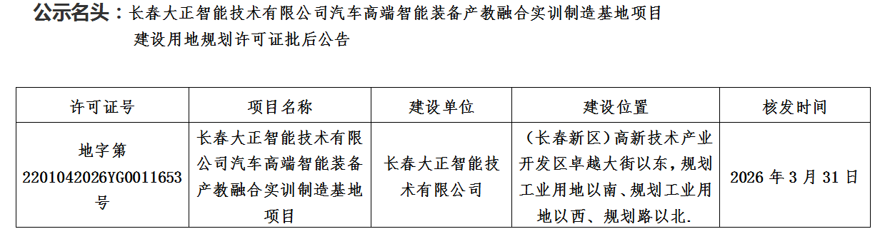长春大正智能技术有限公司汽车高端智能装备产教融合实训制造基地项目 建设用地规划许可证批后公告
