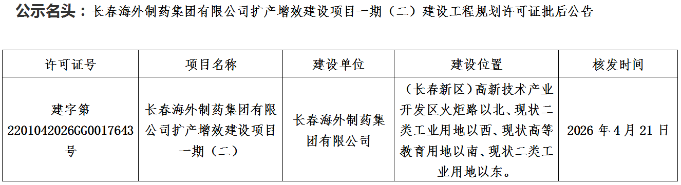 长春海外制药集团有限公司扩产增效建设项目一期(二)建设工程规划许可证批后公告