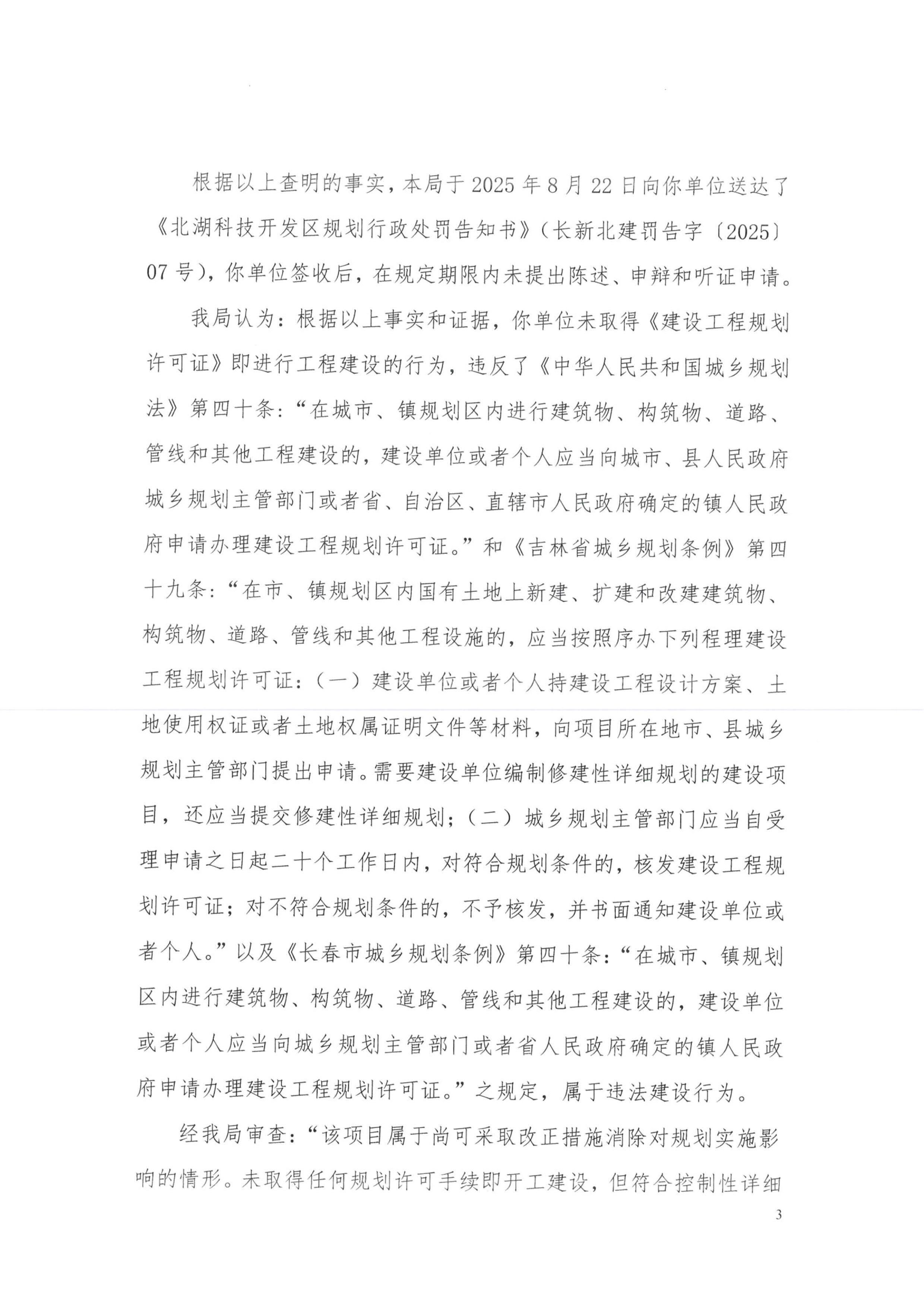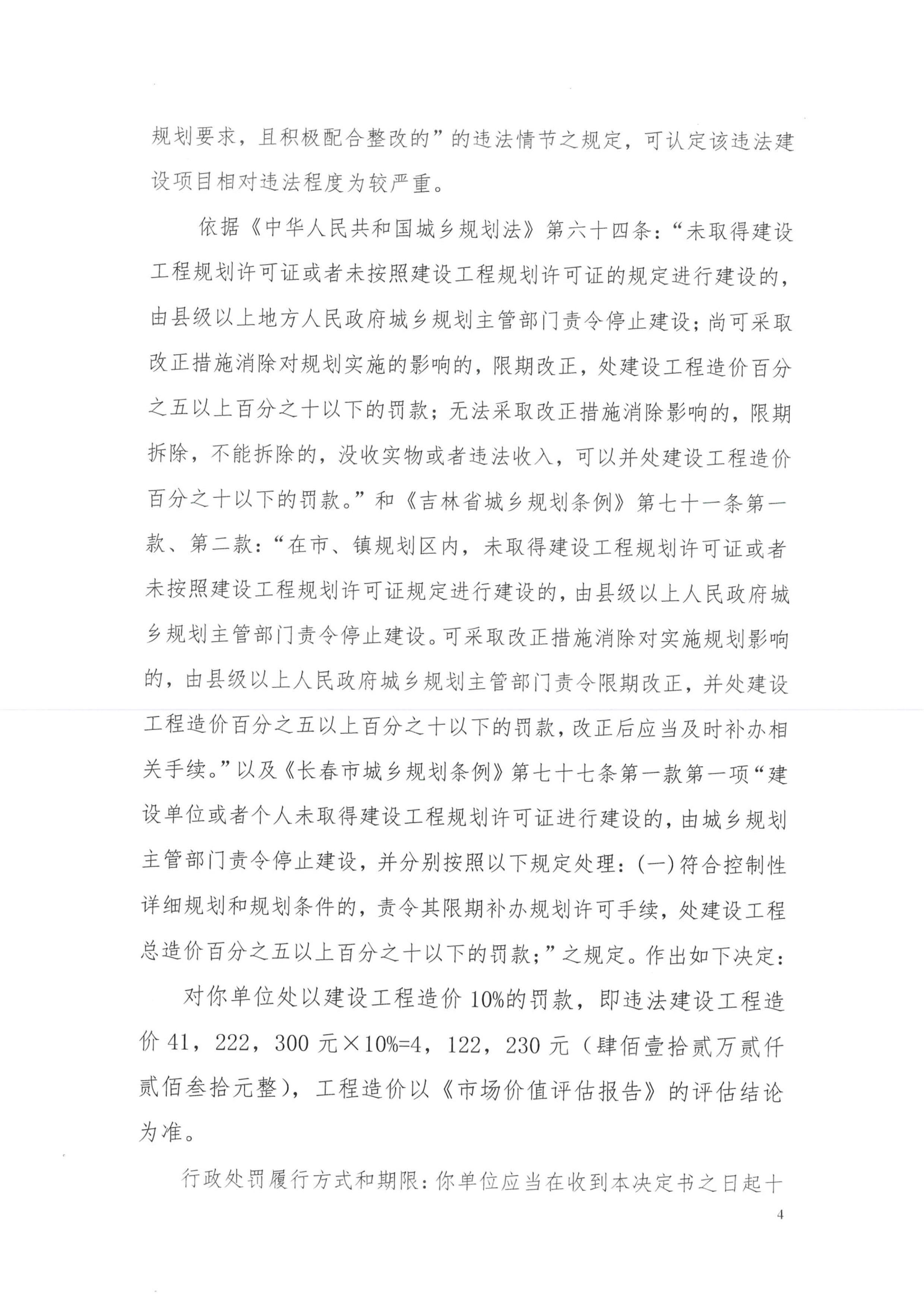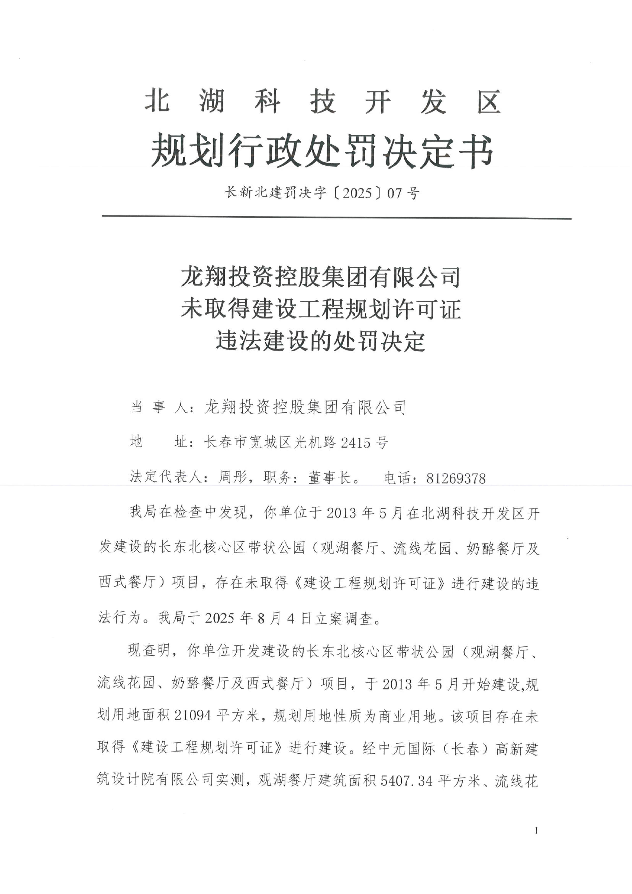 龙翔投资控股集团有限公司未取得建设工程规划许可证违法建设的处罚决定