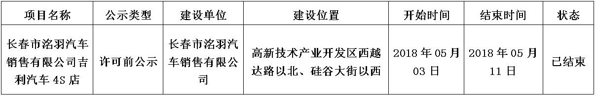 长春市洺羽汽车销售有限公司吉利汽车4S店行政审批批前公示