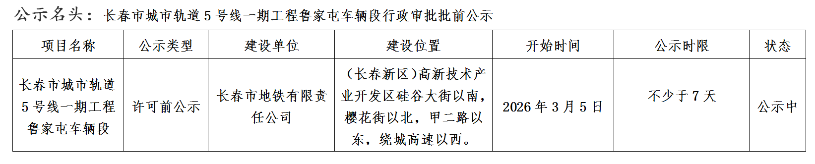 长春市城市轨道5号线一期工程鲁家屯车辆段行政审批批前公示