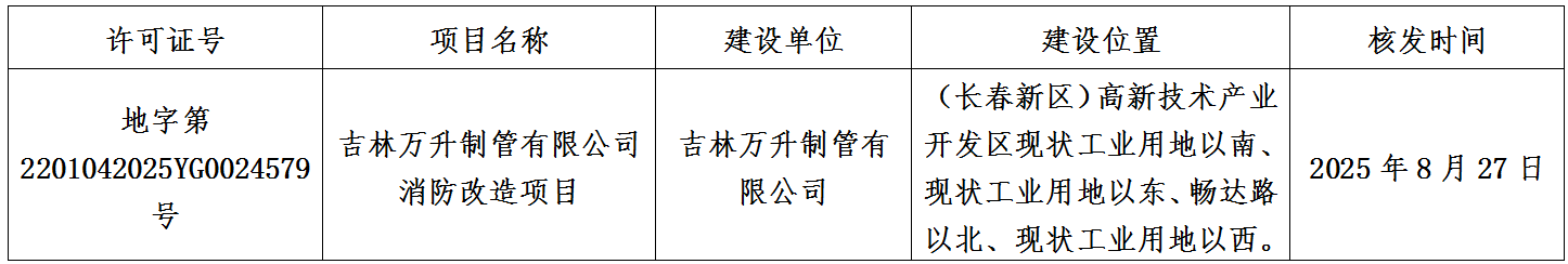 吉林万升制管有限公司消防改造项目建设用地规划许可证批后公告