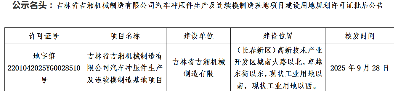 吉林省吉湘机械制造有限公司汽车冲压件生产及连续模制造基地项目建设用地规划许可证批后公告
