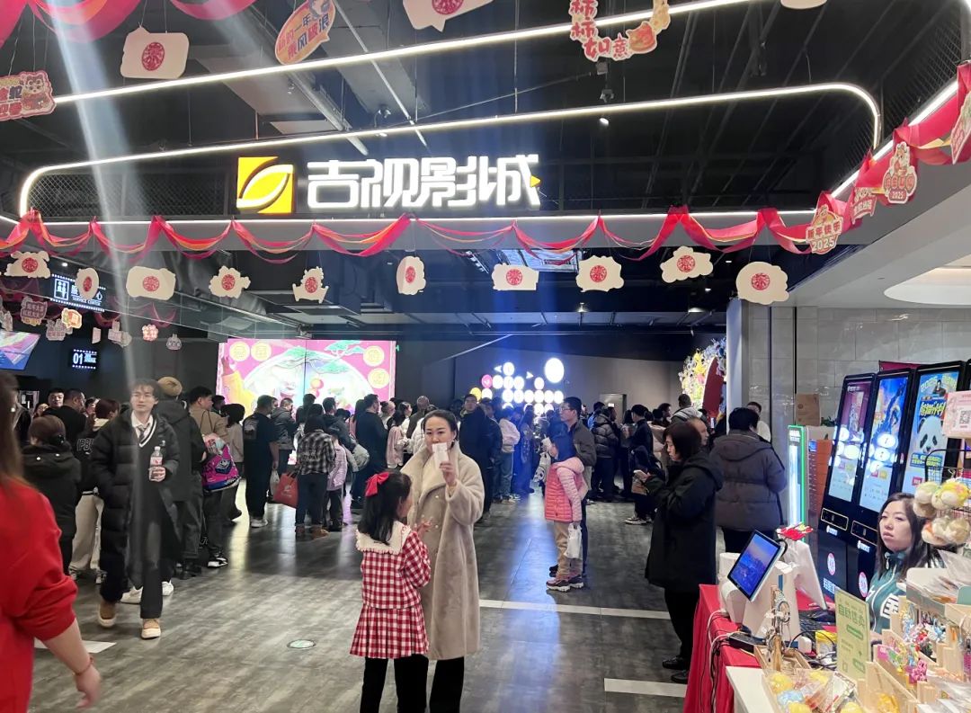 同时,长春新区各大商业综合体影城新春观影热潮涌动,影院大厅朱红灯笼、鎏金贺岁条幅与生肖装饰相映成趣,营造出浓郁的春节氛围,检票口前等候入场的观众排成长队。
