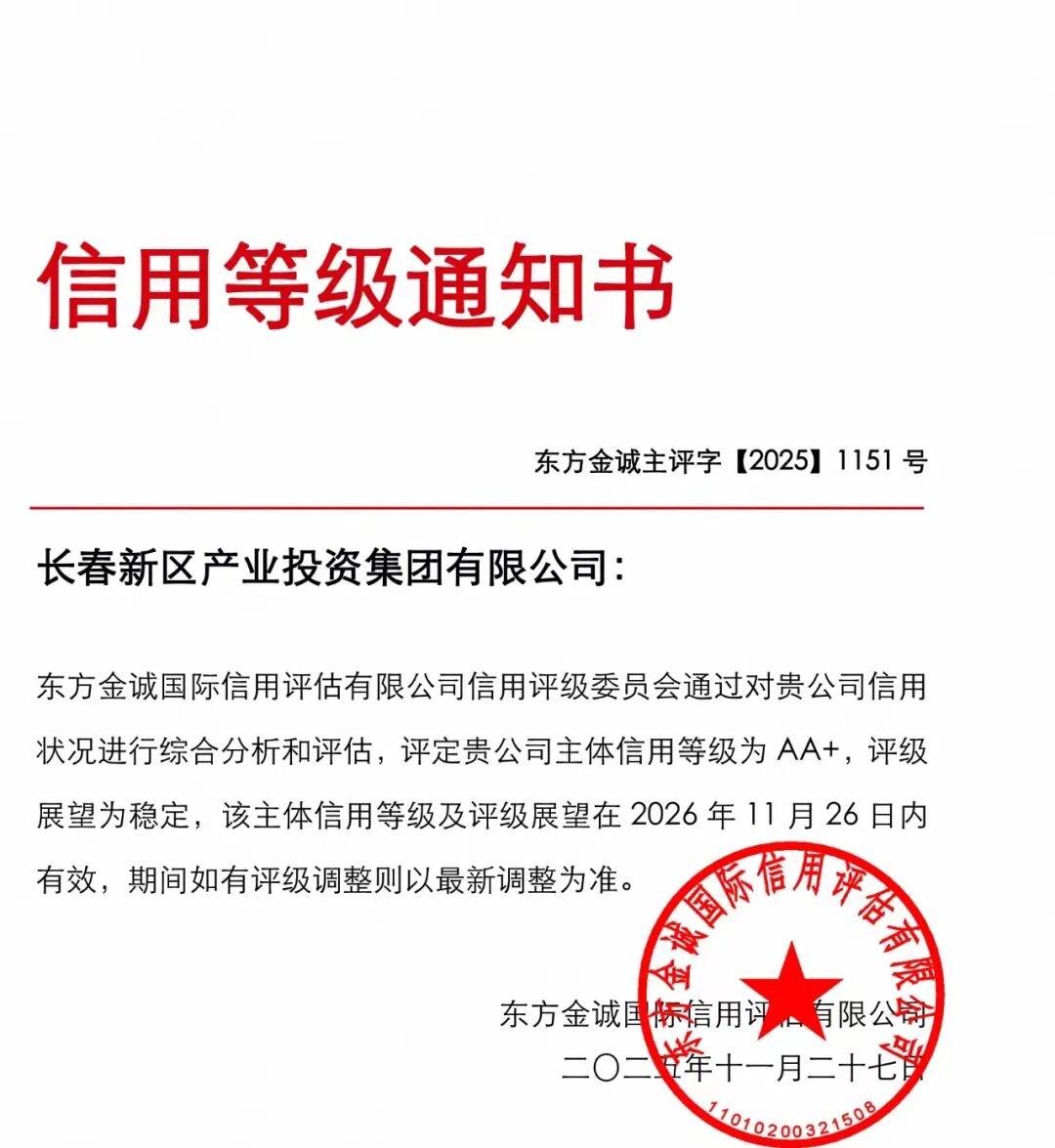 近日,国内权威信用评级机构——东方金诚国际信用评估有限公司正式发布长春新区产业投资集团有限公司主体信用评级报告,给予产投集团AA+主体信用评级。截至目前,长春新区已有三家国有企业获得主体信用评级。