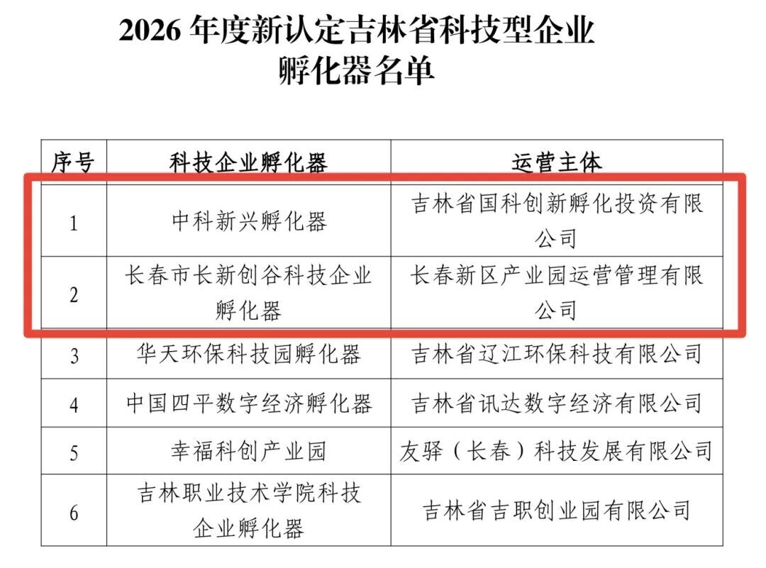 近日,吉林省科学技术厅发布《关于公布2026年度新认定吉林省科技型企业孵化器名单的通知》,全省共6家单位,长春新区长新创谷、北湖新兴产业园(原中科新兴产业园)2家企业孵化器入选、占全省新增数量的1/3。