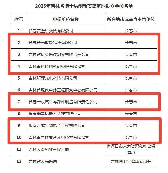 企业设立博士后创新实践基地,是吉林省推动产学研深度融合、强化企业创新主体地位、促进高层次青年人才向重点产业聚集的又一实质性举措。此次公布的2025年度新设立吉林省博士后创新实践基地共12家单位,长春新区长春长光智欧科技有限公司、吉林省科英医疗激光有限责任公司、吉林省科技创新研究院有限公司、长春一东汽车零部件制造有限责任公司、长春万成生物电子工程有限公司、吉林省巨程智造光电技术有限公司6家单位入选。截至目前,长春新区博士后科研工作站、创新实践基地总数已达49家,其中,国家级博士后科研工作站23家、占全省总量的39.6%,吉林省博士后创新实践基地26家、占全省总量的24.5%。