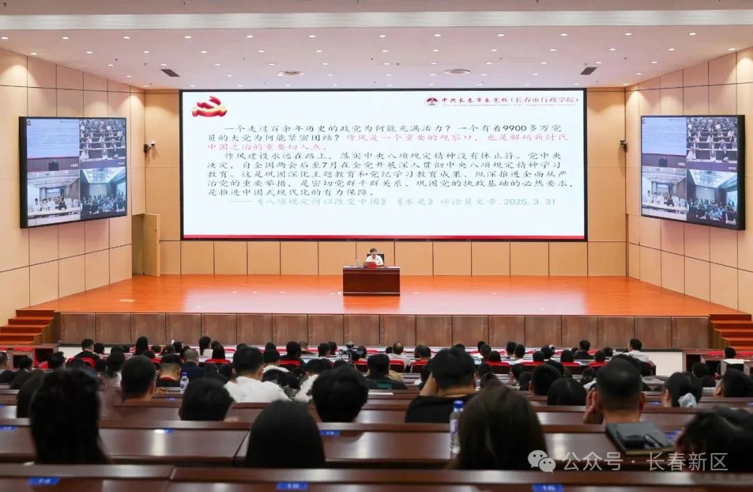 下午读书班上,长春新区1365名年轻干部集中观看警示教育视频。中共长春市委党校哲学教研部副教授路琳娜为全区年轻干部作《深化落实中央八项规定精神,推进作风建设常态化长效化》专题培训。