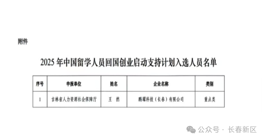 近日,依托欧美同学会东北海创中心的引才聚智优势,长春新区企业鹏耀科技(长春)有限公司创始人王然,成功入选2025年中国留学人员回国创业启动支持计划重点类项目,获国家人事部50万元资助。这是近五年来吉林省唯一获留学人才重点类资助的项目,本次资助将为项目在技术研发与产业化落地等方面注入强劲动能。