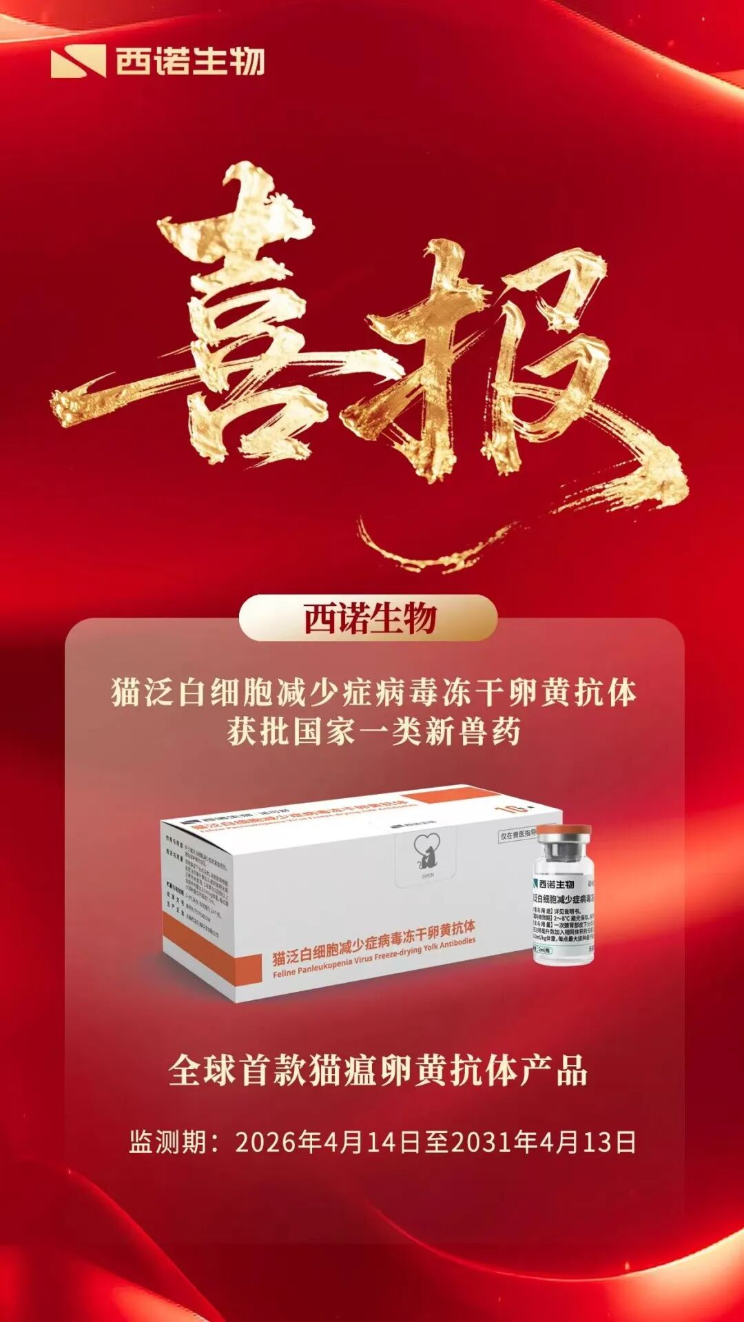 近日,农业农村部发布公告,依据《兽药管理条例》《兽药注册办法》规定,批准长春新区企业——长春西诺生物科技有限公司自主研发的猫泛白细胞减少症病毒冻干卵黄抗体为国家一类新兽药,核发新兽药注册证书。该产品为全球首款猫瘟卵黄抗体产品,标志着我国在猫瘟特异性生物治疗领域实现全球领跑,填补国际猫瘟被动免疫制品空白。