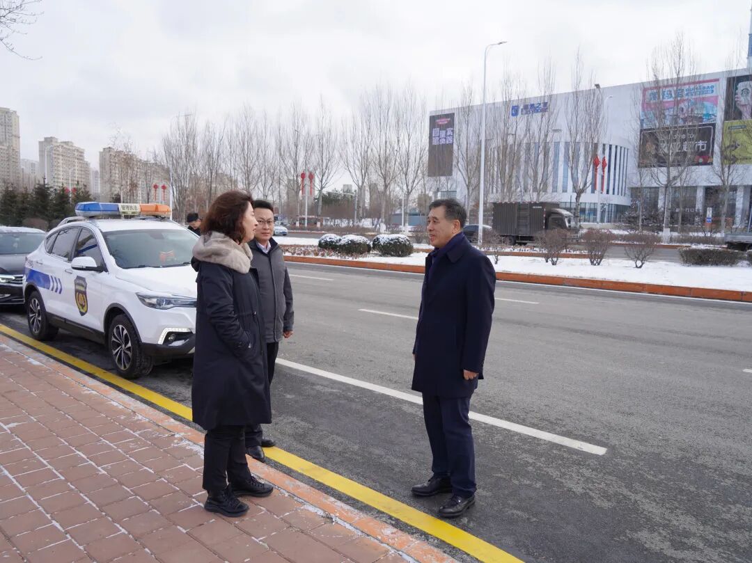 在中商·世界里门前,检查组实地查看路面清雪作业情况,详细了解人员调配、机械力量投入、作业流程以及除冰清雪进展等情况,并叮嘱环卫工人做好自身防护、注意安全。