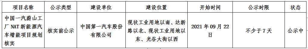 中国一汽蔚山工厂NAT新能源汽车增能项目规划核实核实前公示
