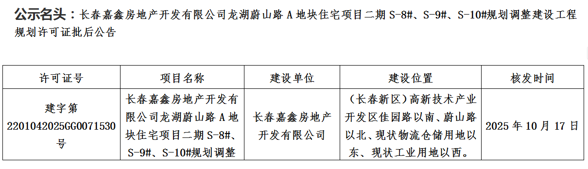 长春嘉鑫房地产开发有限公司龙湖蔚山路A地块住宅项目二期S-8#、S-9#、S-10#规划调整建设工程规划许可证批后公告