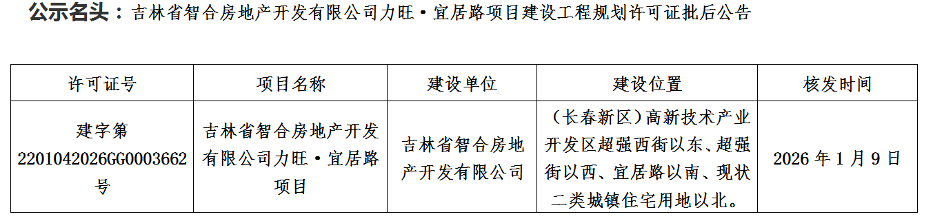 吉林省智合房地产开发有限公司力旺·宜居路项目建设工程规划许可证批后公告
