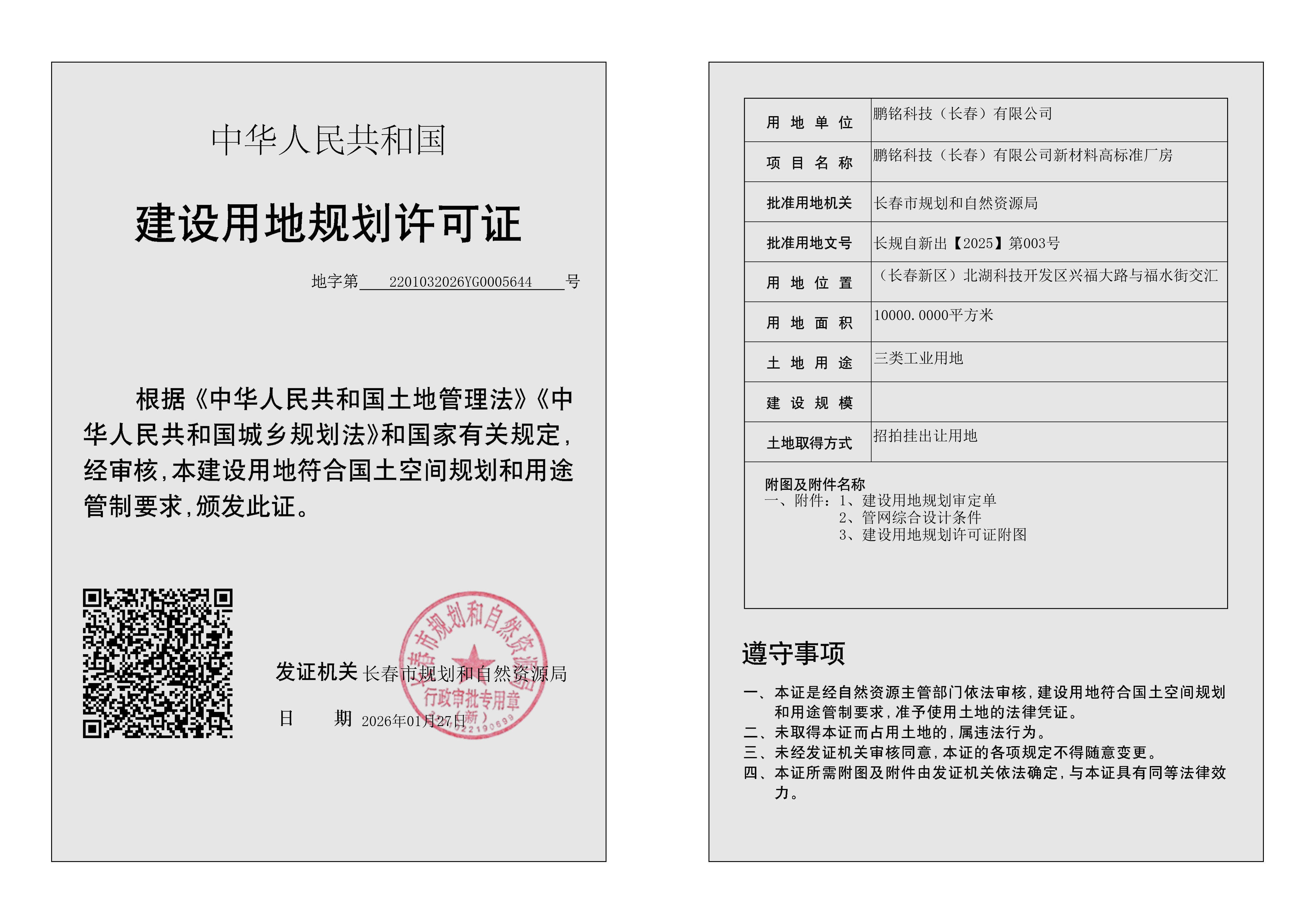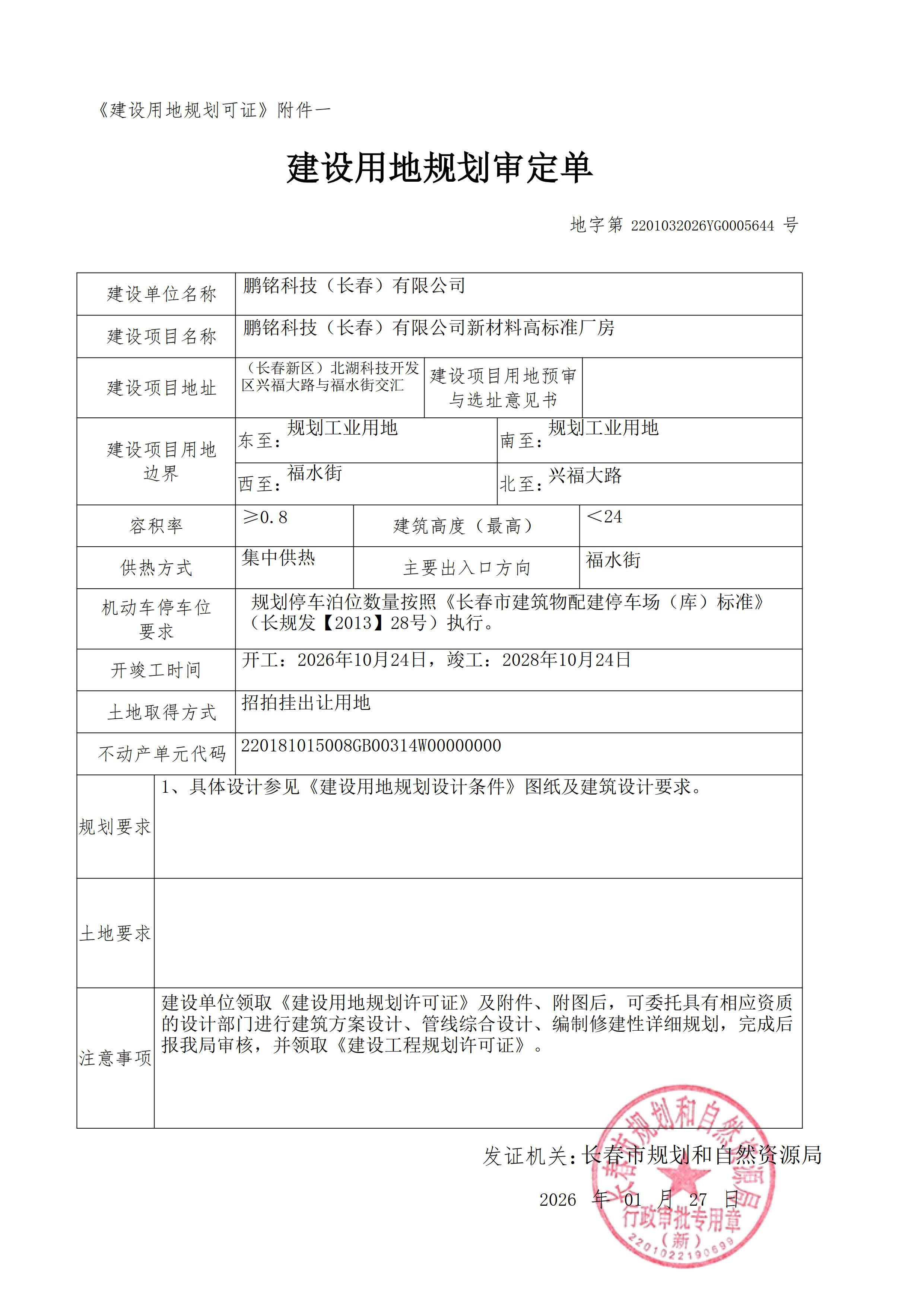 鹏铭科技(长春)有限公司新材料高标准厂房批后公告