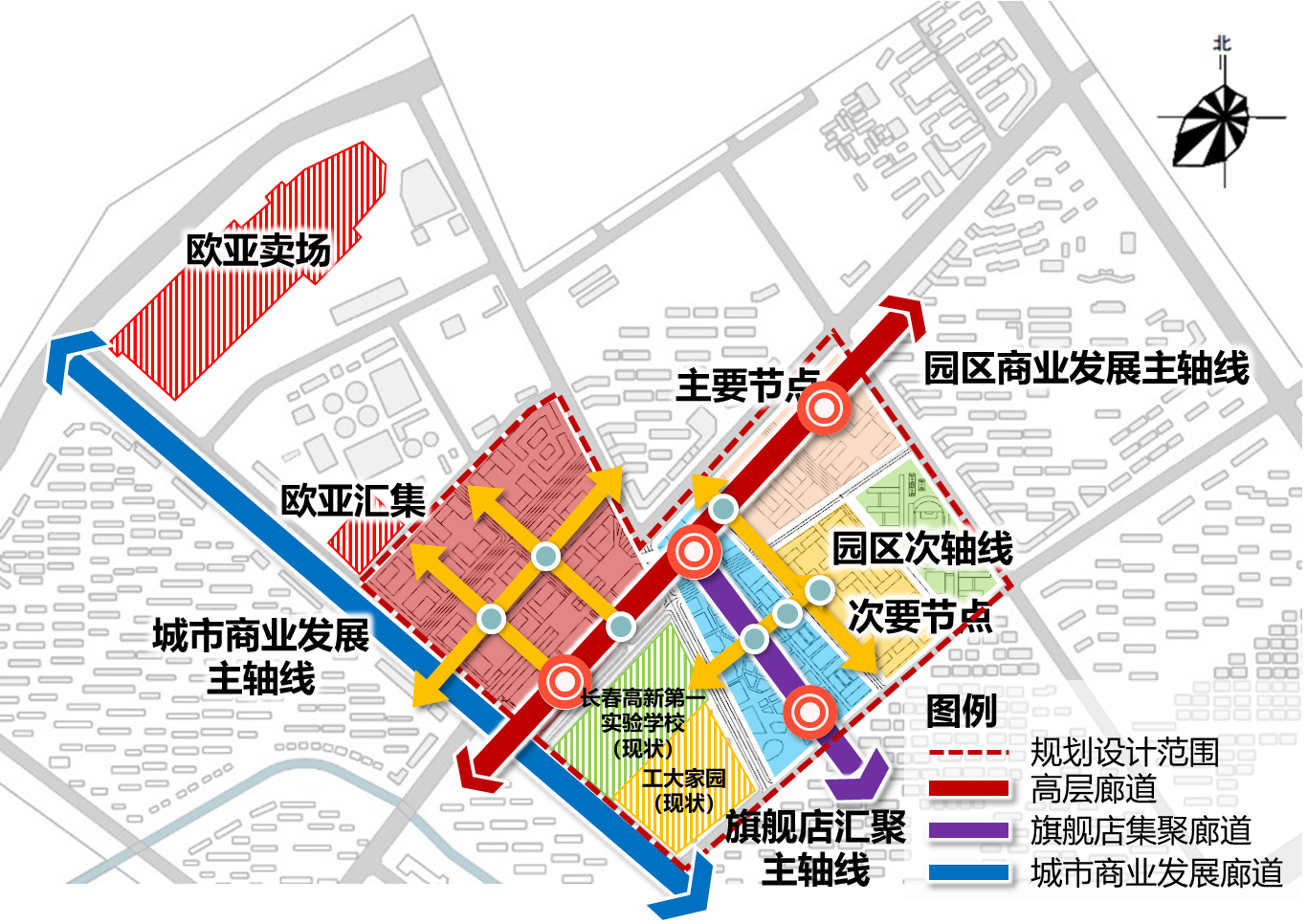 为全面落实国家关于高质量发展的相关要求,长春高新区围绕飞跃路以北、繁荣路以西、飞跃东路以南、光谷大街以东地块开展城市更新设计,以期推进夜经济和高端服务业的高质量发展。本项目从国家目前主推的夜经济发展出发,确定本项目的设计目标为“高消费人群城央旗舰不夜城”,并将其拆解为三大子目标:“Anchor+超级旗舰集群”;“IP+中产共识圣地”;“Max+全天候活力区”。