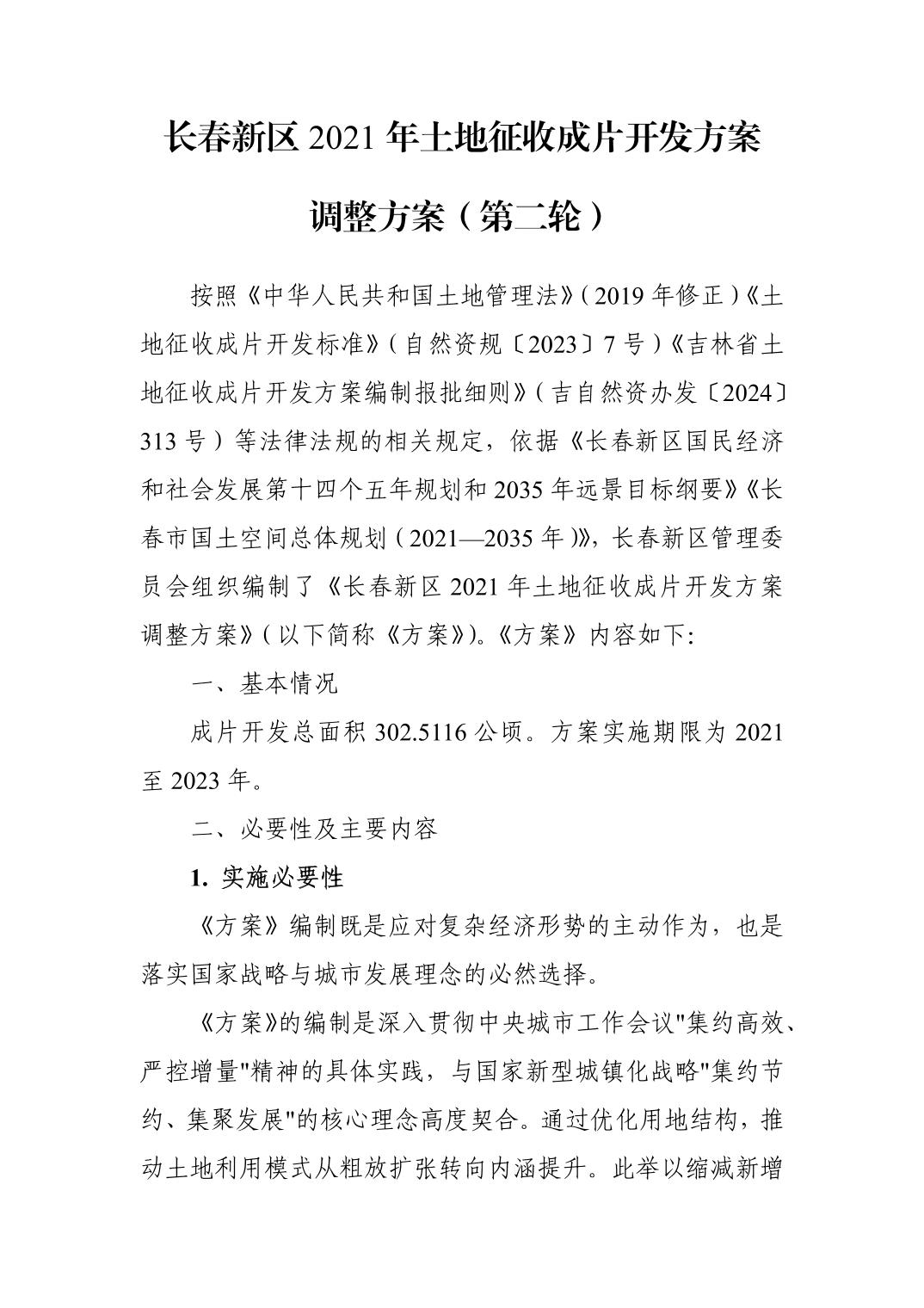 按照《中华人民共和国土地管理法》(2019年修正)《土地征收成片开发标准》(自然资规〔2023〕7号)《吉林省土地征收成片开发方案编制报批细则》(吉自然资办发〔2024〕313号)等法律法规的相关规定,长春新区管理委员会组织编制了《长春新区2021年土地征收成片开发方案调整方案(第二轮)》。现将方案主要内容进行公示,向社会广泛征求意见。在公示期间,公众可通过以下途径和方式提出反馈意见。