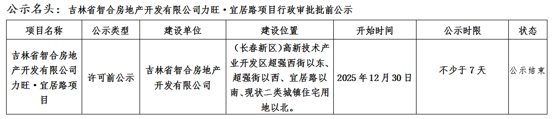 吉林省智合房地产开发有限公司力旺·宜居路项目行政审批批前公示