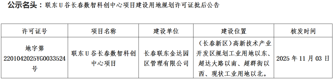联东U谷长春数智科创中心项目建设用地规划许可证批后公告
