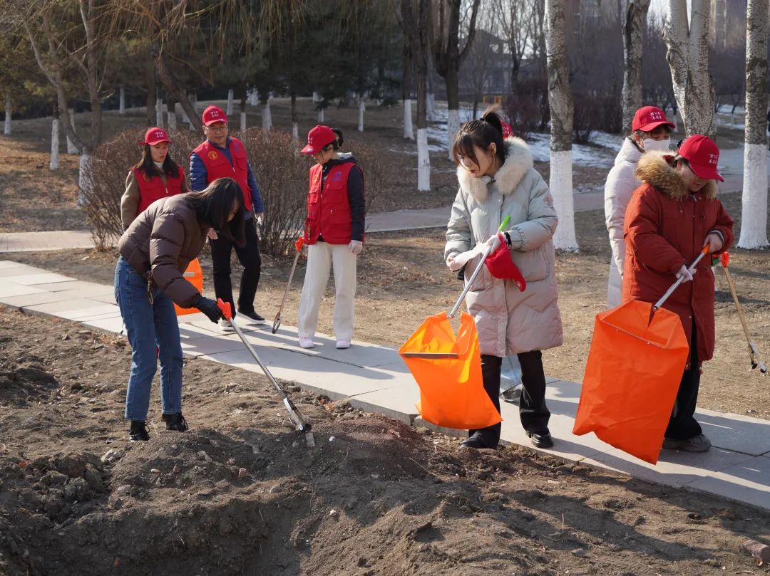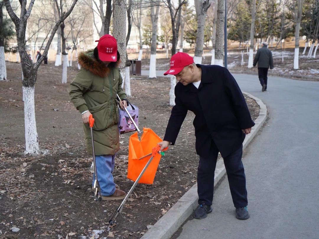 午后微风不燥,阳光正好,志愿者们满怀热忱地在前进公园门口集合。鲜红的“蒲公英”志愿者旗帜迎风飘扬,艳丽的“小红帽”成了初春一道靓丽的风景线,大家手持垃圾夹、铲子等清洁工具,分工协作,深入公园的每一处角落。志愿者们三人一群、两人一组,认真清扫路面的落叶和杂物,每一个动作都充满专注与执着;在公园的树丛间,志愿者们则化身“环保卫士”,用垃圾夹仔细夹起藏在树丛中的垃圾,不放过任何一个破坏环境美观的小物件;面对公园内的小广告,志愿者们用铲子耐心铲除,那些影响公园美观的“城市牛皮癣”在大家的努力下逐渐消失,公园重新恢复了清爽整洁的面貌。