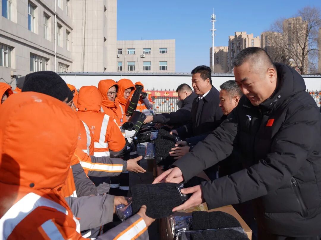 在长春恒创市容环卫集团有限公司,齐林卫亲手为环卫工人送上帽子、手套、保暖护膝等御寒物资,反复叮嘱大家在户外作业时务必做好保暖防护,注意自身安全,合理安排作息,避免过度劳累。一句句暖心的叮嘱、一份份实用的物资,让在场的环卫工人深切感受到冬日里的关怀与温暖。