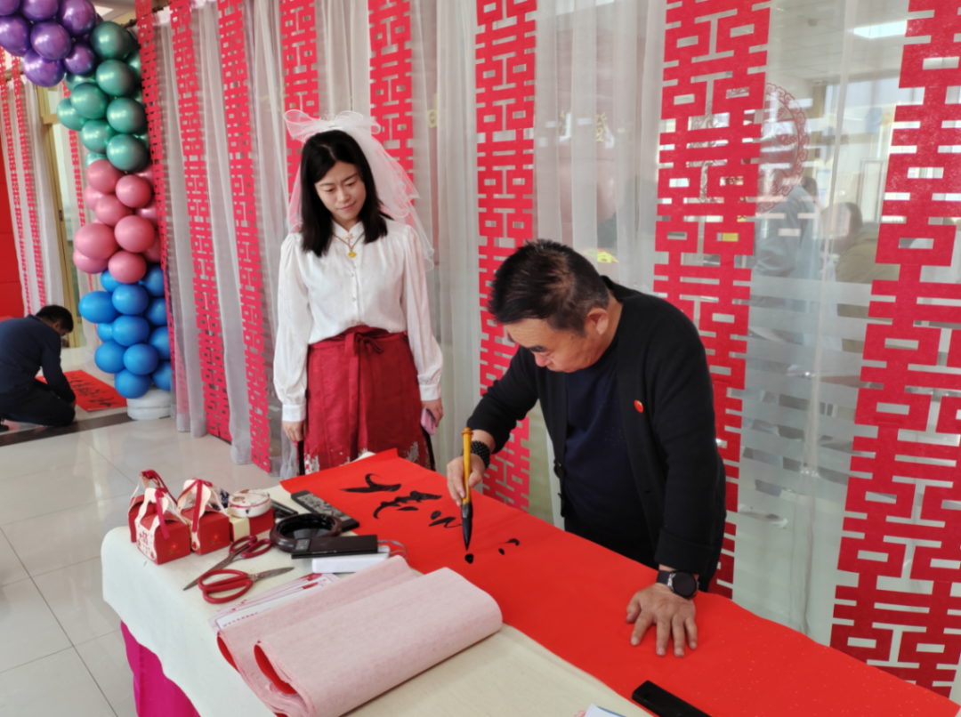 颁证仪式结束后,新人们流连忘返,饶有兴致的参加了“夫妻敬茶”“趣味投壶”“幸运大转盘”等活动。书法老师孙正文现场为新人挥毫泼墨,赠送“百年好合”“天赐良缘”等多幅书法作品。活动中还邀请了心理咨询师和社会工作师为新人提供婚姻家庭指导和心理咨询服务,分发宣传册,帮助大家尽快地完成角色转变,顺利适应婚姻生活。活动还宣传了抵制高价彩礼等内容,传递新时代文明婚恋观的重要价值观,新人们表示本次活动很有意义,更值得回味。