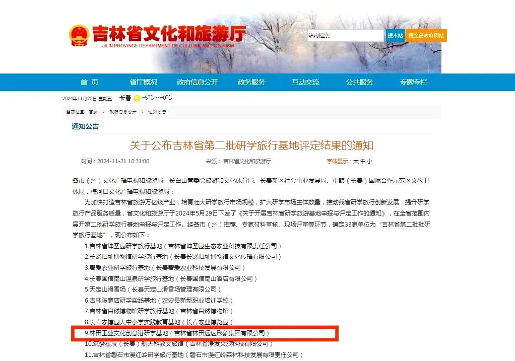 近日,吉林省文化和旅游厅公布吉林省第二批研学旅行基地评定结果,长春新区林田工业文化创意港研学基地(吉林省林田远达形象集团有限公司)上榜!