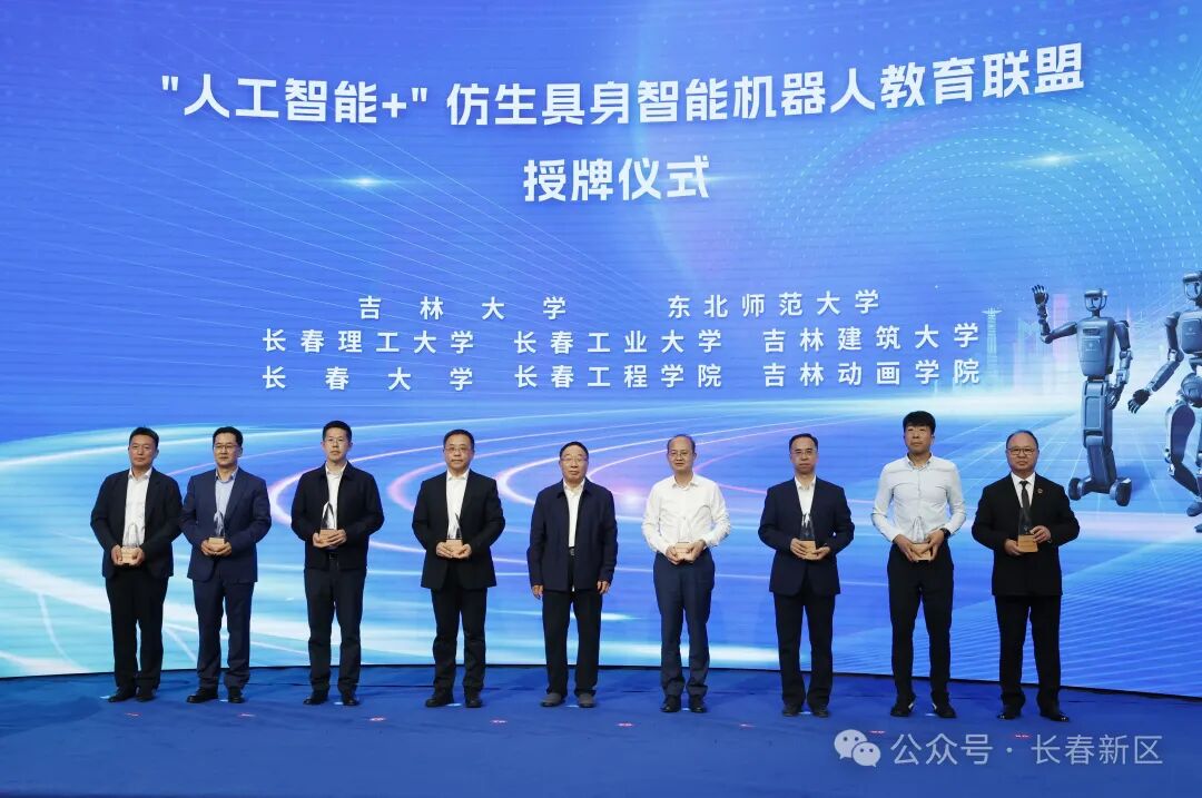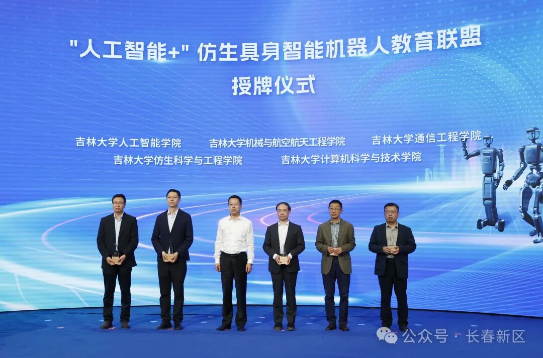在“人工智能+”仿生具身智能机器人教育联盟授牌环节,中国科学院院士、吉林大学教授任露泉为吉林大学、东北师范大学、长春理工大学、长春工业大学、吉林建筑大学、长春大学、长春工程学院、吉林动画学院等联盟代表授牌;长春市委副书记、长春新区党工委书记闻然为吉林大学人工智能学院、吉林大学机械与航空航天工程学院、吉林大学通信工程学院、吉林大学仿生科学与工程学院、吉林大学计算机科学与技术学院等联盟单位学院代表授牌。