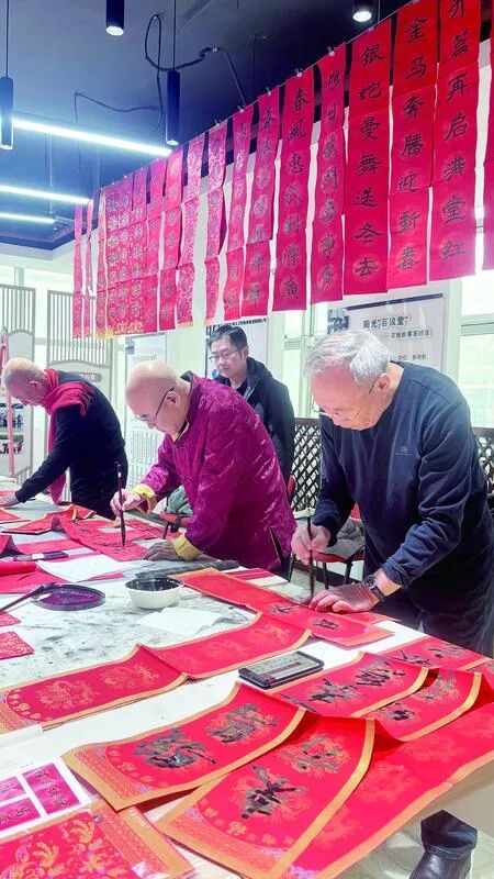 “从2012年开始,我每年都来参加社区的新年活动,今年的活动比以前更加丰富,刚进门就被写春联的摊位吸引,满是浓浓的新年氛围。”居民李钧大爷手里拿着刚领到的糖葫芦,满脸笑意地说。在对联创作区,5位书法爱好者挥毫泼墨,隶书、楷书、行书各有韵味,“新春快乐”“福满家园”等吉祥话语跃然纸上,笔墨飘香间满是对新年的美好祈愿。