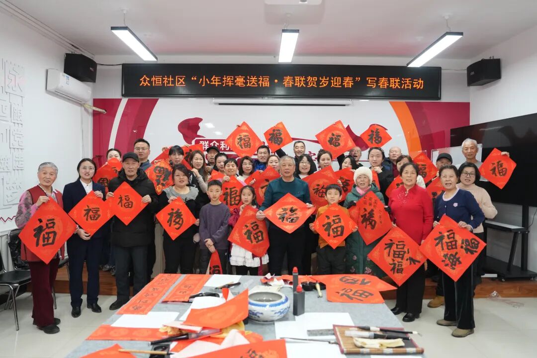 飞跃街道众恒社区的“小年挥毫送福”活动现场,墨香扑鼻。书法爱好者李振天老师带着大家写福字、写春联,不少居民也兴致勃勃提笔体验,风格各异的作品铺满桌台。现场还穿插反诈小课堂,提醒大家守好“钱袋子”。一位阿姨笑着说:“这活动太有年味了,红红火火真喜庆!”兴华社区、永达社区、超强社区、卓越社区等也纷纷铺纸研墨,把一张张“福”和一副副春联,送到居民手中。