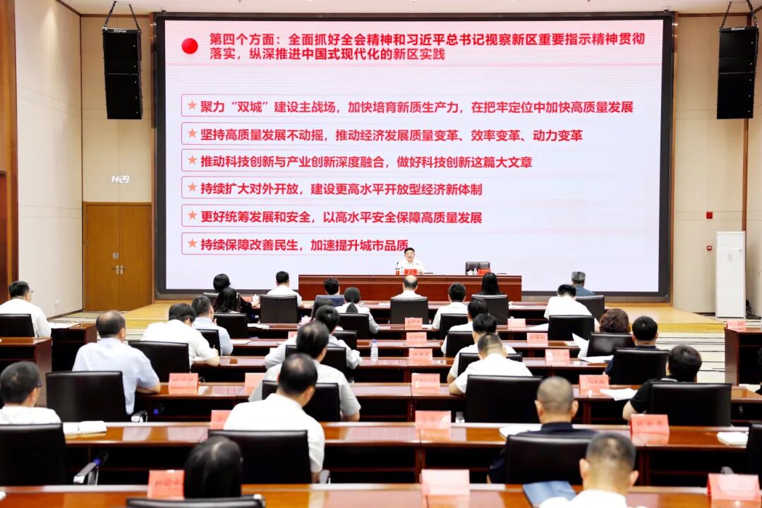 朱光明强调,要深刻认识进一步全面深化改革、推进中国式现代化的重大意义,深入领会进一步全面深化改革的指导思想、总目标和重大原则,全面准确把握《决定》提出的进一步全面深化改革重大举措,全面抓好全会精神和习近平总书记视察新区重要指示精神贯彻落实,纵深推进中国式现代化的新区实践。一要聚力“双城”建设主战场,加快培育新质生产力,充分发挥改革的突破和先导作用,不断激发经济社会发展动力活力。二要坚持高质量发展不动摇,把“发展只能是、必须是高质量发展”的要求,贯穿新区经济社会发展全过程各方面,推动高质量发展实现明显进位。三要推动科技创新与产业创新深度融合,加快布局应化所北湖园区、吉大仿生实验室等源头创新平台。四要持续扩大对外开放,建设更高水平开放型经济新体制,加快完善国际陆港口岸基础设施。五要更好统筹发展和安全,以高水平安全保障高质量发展,守住安全底线、生态红线、耕地红线、地方债务警戒线、统计数据质量线。六要持续保障改善民生,坚持“生产、生活、生态”三生融合,聚焦群众急难愁盼问题找准改革发力点和突破口,扎实推进“幸福新区”行动计划。