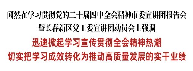 11月17日,学习贯彻党的二十届四中全会精神市委宣讲团报告会暨长春新区党工委宣讲团动员会以视频形式召开。市委宣讲团成员,长春市委副书记、长春新区党工委书记闻然作宣讲报告并动员讲话,强调要深入学习贯彻党的二十届四中全会精神,在省、市委的坚强领导下,开拓创新、笃行实干,以新气象、新担当、新作为推动长春新区高质量发展,努力在推动中国式现代化建设、省市振兴突破中作出更大贡献。长春新区党工委副书记、管委会主任徐勇主持会议并宣读新区党工委宣讲团成员名单,长春新区党工委副书记李广明出席会议。