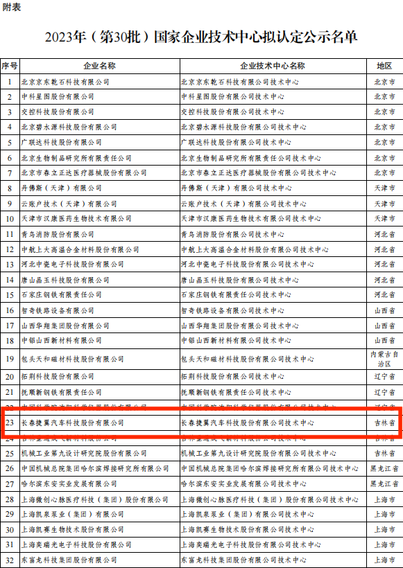近日,国家发展改革委发布了2023年(第30批)国家企业技术中心拟认定名单,我省汽车零部件领域的高新技术企业——长春捷翼汽车科技股份有限公司荣登榜单!此次国家企业技术中心申创成功,不仅是对长春捷翼汽车科技股份有限公司研发能力、技术能力和创新成果的肯定,更是长春捷翼汽车科技股份有限公司坚持创新驱动发展的有力体现。