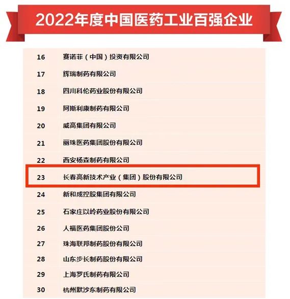 长春新区生物医药龙头企业长春高新技术产业(集团)股份有限公司(简称“长春高新”)荣登百强榜第23位,较上年排名上升4位。