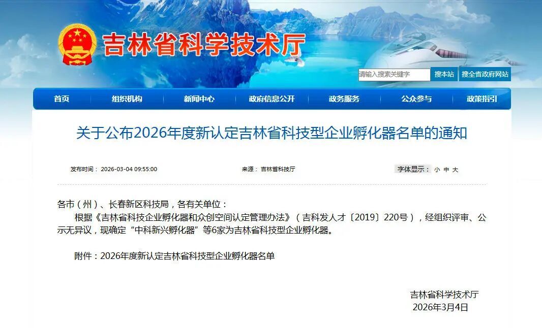 近日,吉林省科学技术厅发布《关于公布2026年度新认定吉林省科技型企业孵化器名单的通知》,全省共6家单位,长春新区长新创谷、北湖新兴产业园(原中科新兴产业园)2家企业孵化器入选、占全省新增数量的1/3。