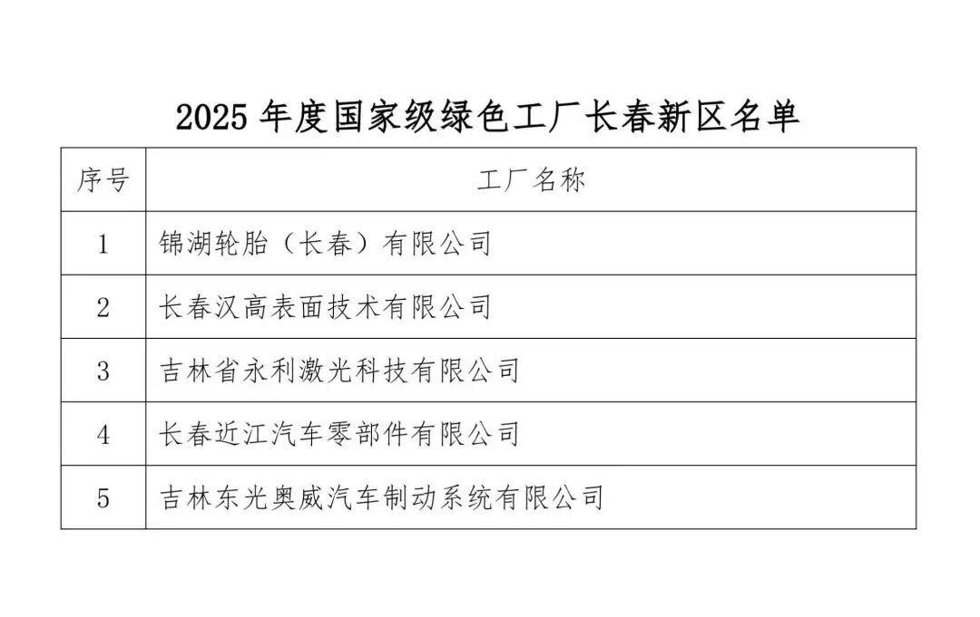 近日,工业和信息化部办公厅正式公布2025年度国家级绿色工厂名单,长春新区5家企业成功入选,占全省入选总数量的三分之一。