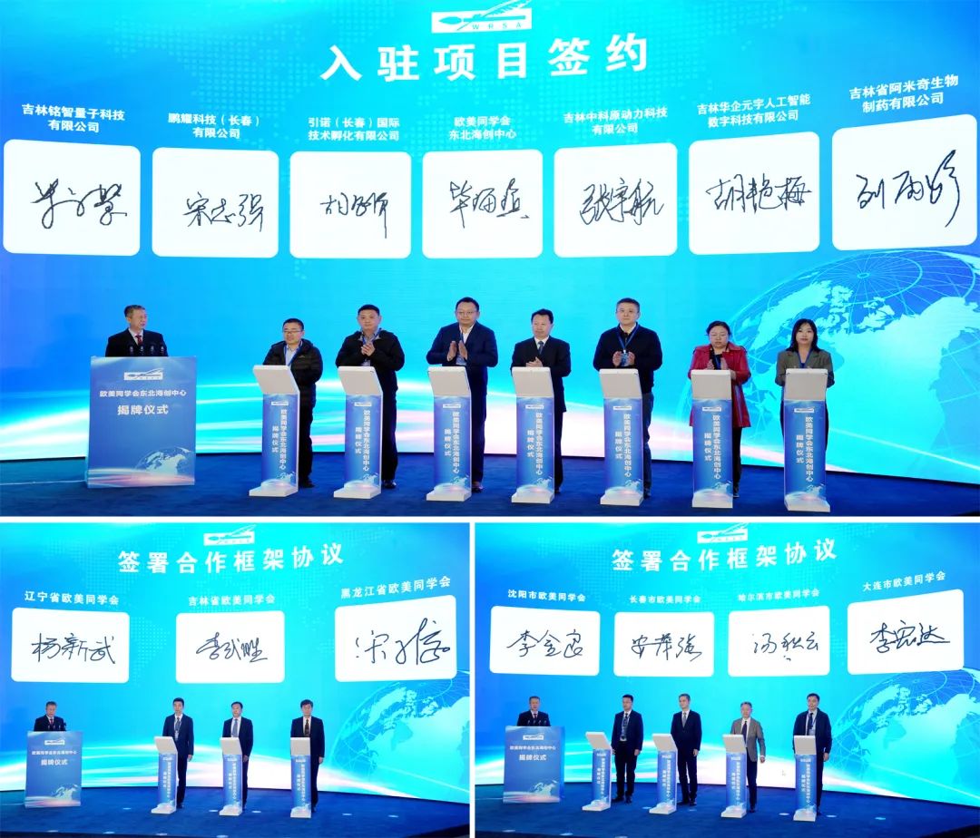 合作签约环节,长春新区管委会与吉林铭智量子科技有限公司、吉林省阿米奇生物制药有限公司、鹏耀科技(长春)有限公司、引诺(长春)国际技术孵化有限公司、吉林中科原动力科技有限公司、吉林华企元宇人工智能数字科技有限公司6家入驻欧美同学会东北海创中心企业进行项目签约;辽宁省、吉林省、黑龙江省欧美同学会签署合作框架协议,沈阳市、大连市、长春市、哈尔滨市欧美同学会签署合作框架协议。